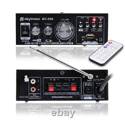 DDA0222 - Skytronic Karaoke Amplifier with Mp3, USB & SD Slot In. A 2x 40W portable Hifi stereo audio power amplifier from Skytronic, with MP3-player and FM radio, ensuring optimal listening pleasure. Even at higher volume levels the amplifier provides a high sound pressure. Featuring USB/SD inputs, Speaker-out protection, remote control etc. Comes with Bass & Treble control and an external 12Vdc socket.