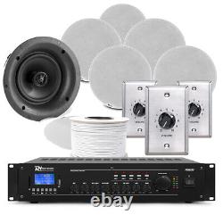 A multi zone ceiling speaker system, this set includes six FCS8 high performance low profile ceiling speakers which feature an 8-inch woofer and coaxial 1 inch directional tweeter for an engaging sound. The 100v line tapping allows for either 10W, 20W or 40W settings for power to suit the installation. Bluetooth connectivity makes it easy to stream music wirelessly from smart devices such as phones, tablets, and laptops. Music can also be played using the onboard USB, SD card MP3 player, or via the RCA line inputs from a CD player or other source device. This volume controllable commercial music system comes with three wall-mount attenuators for convenient local area level control.