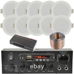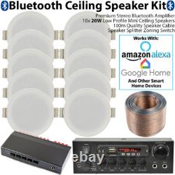 Premium Bluetooth Ceiling Speaker System What's included in this kit. 1x 110W PREMIUM QUALITY Bluetooth Stereo Amplifier 10x 20W Mini 3 Inch Low Profile Ceiling Speakers 1x 5 Zone (10 Speaker Max) Switch - zones can be switched on/off 100m Quality Speaker Cable (if you require more, please get in touch) Instruction Manuals. 1 We offer a premium quality audio system that will not be out of place in any home or place of work. 2 The ceiling speakers supplied are compact, low profile and look great when installed unlike a lot of other ceiling speakers on the market that can look bulky when installed.