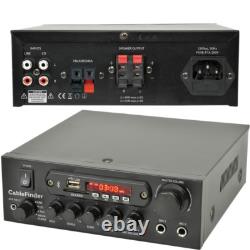 You can install them wherever you need them but always keep them in pairs for the best quality sound! 6 selectable line inputs 1x - Bluetooth receiver (wireless) 2x - 2 RCA/Phono (red & white) inputs 1x - 3.5mm AUX jack 1x - USB media input 1x - SD Card media input 2x 6.35mm Microphone inputs - Allows you to use as a loud hailer / public speaking / karaoke system 1x FM Antenna Connections 2x - spring terminal / speaker cable (red & black) outputs Built-in FM receiver Sleek and compact design Durable metal body with breathable air vents built in. UK mains power cable supplied.