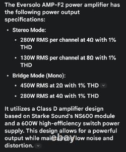 Elevate your audio experience with the Eversolo AMP-F2 Power Amplifier, a sleek and versatile addition to your audio setup. With a black finish that blends seamlessly into any environment, this amplifier is designed to deliver high-fidelity sound with its 2-channel output configuration.
