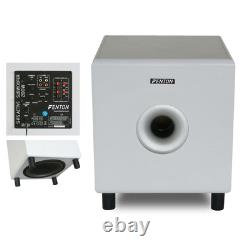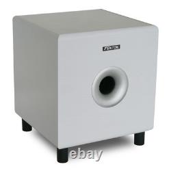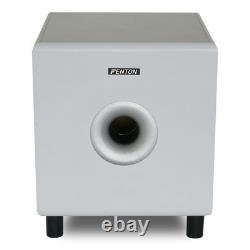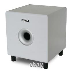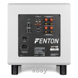 Fenton SHFS08W HiFi Subwoofer 8-Inch Powered Speaker for Home Audio. Fenton's SHFS08W is a HiFi subwoofer with a sleek white finish that blends well with the decor of any room. This home audio subwoofer features a downfiring 8-inch driver that is placed at the bottom of the unit. The woofer's downfiring design means that the sound output will be directed straight at the floor, ideal for rooms with wood floors since the bass tones will be boosted naturally. The RCA line input and output connections on the back of this home audio subwoofer allow you to connect it to a variety of devices and systems.