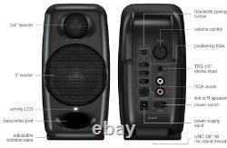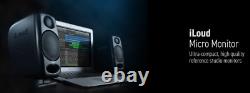 Acoustic settings: high shelf (0dB or +2dB from 4kHz up); low shelf (0dB or -3dB from 250Hz down); desktop (+3.5dB between 1kHz and 10kHz and -1dB below 400Hz). System total latency (analog input): 1.02 ms. System total latency (Bluetooth input): 155 ms (depends on host implementation, tested on iPhone 6S / iOS 10.0.1). Connectors: 2 x RCA input (cable included); TRS 1/8 stereo input; 4-pin speaker connector (cable included). Bluetooth® compatible with A2DP protocol. Size: 180mm/7.09" x 135mm/5.31" x 90mm/3.54. Weight: 920g/32.45oz (left speaker), 800g/28.22oz (right speaker), 1,720g/60.67oz (left + right speaker).2 x iLoud Micro Monitor speakers. 4-pin speakers connection cable (2m/6.56'). TRS 1/8 stereo to 2 x RCA cable (1.5m/4.92').