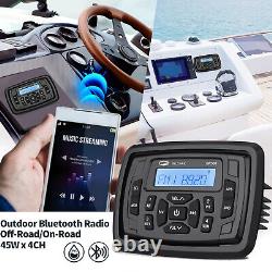 Bluetooth: long distance music Streaming. RMS Power Output: 4 x 40W. Meets ASTM B117 salt/fog standard. Input Types: Bluetooth, USB, AUX. Outputs: 1 pair RCA Out.