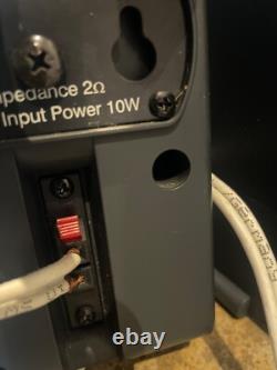 Fabric covering sub woofer and speakers has some marks. Cables in good condition, one Jack for one speaker is missing the clip (see photo) but the speakers both work fine. Sound is excellent, all in working order.