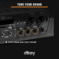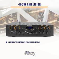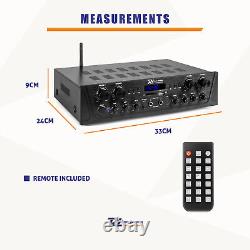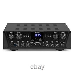 Featuring a USB/SD card slot for MP3/WMA playback a FM radio with LED display and two microphone inputs with tone and Bass/Treble sound control, this amplifier is suitable for home or office use. 4-Channel Amplifier system with 4x 100W. Connect up to 4 pairs of speakers and adjust them individually. MP3 player with USB port/SD card reader. Bluetooth receiver for audio streaming.