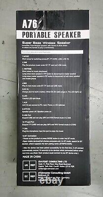 Use TF card and USB flash drives to play your music and enjoy different listening modes. Portable Shoulder Strap and Long Time Play? The A76 Bluetooth speaker has a built-in 4000 mAh rechargeable lithium battery, which can continuously providing up to 610 hours play time (depends on playing volume) when fully charged. The A76 is equipped with a carrying strap, the user-friendly design will be convenient for you to carry when traveling and make you look cooler. Cool Mixed Color LED Lights and EQ Effect?