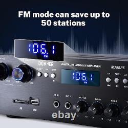 0 Watt Haute puissance Contrôle Indépendant. L'amplificateur audio stéréo Bluetooth Donner dispose de 4 CANAUX qui sont contrôlés indépendamment. Il vous offre une puissance de crête de 600W qui peut être utilisée pour 4 groupes de 8 haut-parleurs avec une impédance de 4 à 8 ohms, vous permettant de profiter d'un son de haute qualité. En plus de la fonction Bluetooth, vous pouvez profiter d'une gamme de sources audio, y compris USB (maximum 32G), carte SD (maximum 16G), 2 paires d'entrées audio RCA pour lecteur CD et lecteur DVD, 2 entrées microphone 1/4 pouce (6,35 mm), AUX IN 3,5 mm, et radio FM avec notre amplificateur bluetooth récepteur home cinéma. Il prend en charge le réglage des aigus et des basses ainsi que le contrôle du volume du microphone.
