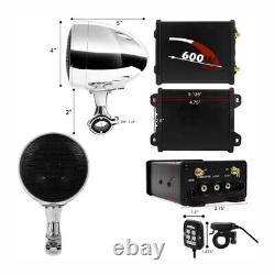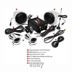 Ce système audio comprend un amplificateur de classe AB et deux haut-parleurs étanches de haute qualité avec des pinces robustes adaptées pour des tubes de 7/8" à 1". Amplificateur multimédia : Bluetooth intégré, radio FM intégrée, prise en charge de l'entrée audio AUX, prise en charge du contrôle filaire fonctionnel complet. Amplificateur puissant : 2.1 canaux, puissance nominale : 225W + 75W, puissance de crête : 600W, taille compacte. Prend en charge un haut-parleur subwoofer externe. Haut-parleur à large bande : espace sonore de 3,5", noyau sonore de 2,5", puissance nominale de 20W, technologie d'amélioration des aigus, performances impressionnantes à des vitesses supérieures à 80 mph.