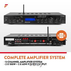 Puissance maximale de 80 W. Bornes de haut-parleur à connexion rapide. Dimensions par haut-parleur (mm) : 120 x 120 x 125. Réponse en fréquence (Hz) : 80-20000. Puissance musicale de crête (W) : 80. DDA1497 - Système de son surround home cinéma AV-150 5 canaux, Bluetooth, FM, USB. Le système home theatre AV150BT est la meilleure solution pour tous vos besoins audio. Ce système tout-en-un est équipé de la technologie sans fil 2.1 BT avancée et fonctionne avec tous les derniers appareils, y compris les smartphones, tablettes, ordinateurs portables et ordinateurs. Profitez du streaming de musique depuis votre collection numérique personnelle. L'AV150BT est un amplificateur multifonctionnel qui dispose de slots USB et SD, ainsi qu'une prise d'entrée auxiliaire 3.5mm et différents connecteurs audio RCA. Parfait pour une utilisation à domicile, au bureau ou dans un magasin, et même pour des installations professionnelles. Puissance de sortie : 2 x 100W + 3x 60W. Lecteur MP3 avec port USB/lecteur de carte SD. Affichage numérique ID3 Tag avec tuner FM.Récepteur BT pour le streaming audio. Sélecteur de mode d'entrée source audio. 2x entrée microphone 6,3 mm Jack. Entrée auxiliaire (Jack 3,5 mm). Options de lecture : Streaming BT, FM-Radio, carte SD, USB.